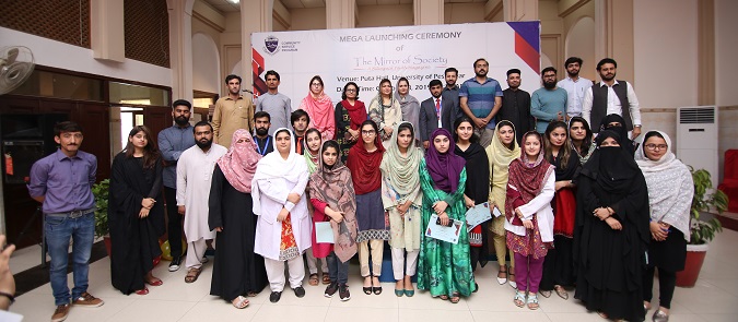 Volunteer Students Writers Guild of the University of Peshawar and other universities notably including Quaid-a-Azam University pose for a group photo with Chief guest MPA Rabia Basri at the formal launching ceremony of bilingual "The mirror of Society" magazine at TCC hall, University of Peshawar on 8th October, 2019. The students magazine was launched informally on first May, 2019
