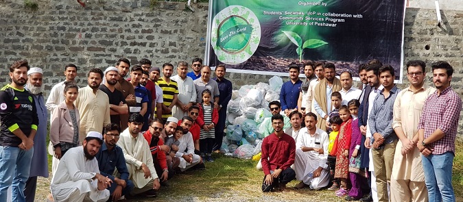 Provost, University of Peshawar Dr. Fazal Sher and Deputy Director Student Societies Dr. Jamal Nasir are posing for a group photo with students and volunteers after successful tree plantation drive of around 500 saplings at the Baragali Summer Campus during 13-16 September, 2019. The campaign also carry thorough cleanliness of the summer camp premises and surroundings.