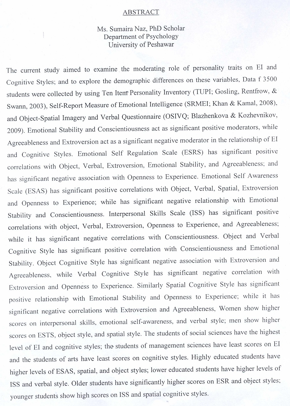 Ms. Sumaira Naz, a Ph.D. Research Scholar at the Department of Zoology, University of Peshawar has submitted her thesis entitled "Moderating Effects of Personality Traits on Emotional Intelligence and Cognitive Styles of University Students" to the University of Peshawar, in partial fulfillment of the requirement for the award of degree of Doctor of Philosophy (Ph. D) in the discipline of Psychology.