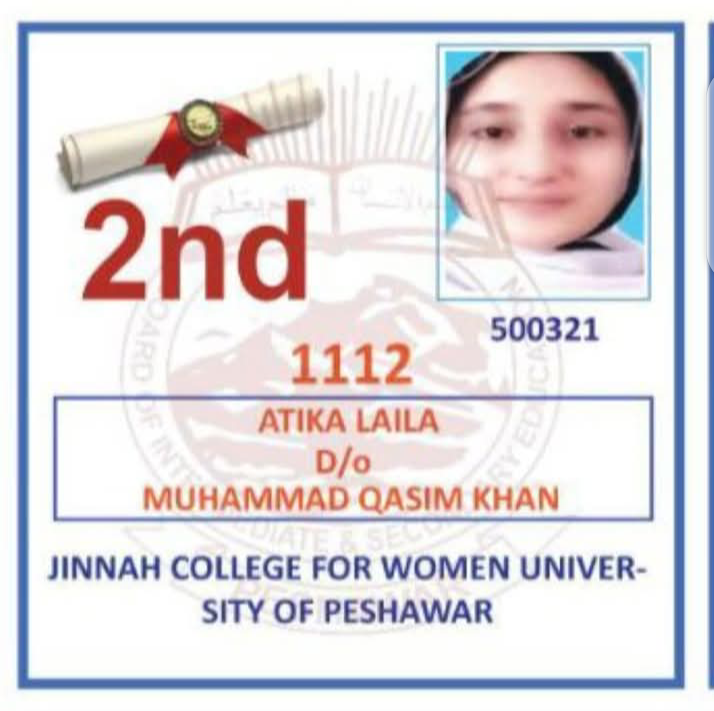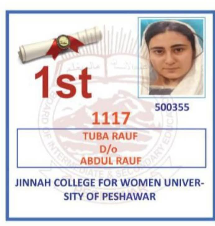 Jinnah College, University of Peshawar, has made a remarkable achievement in the Board of Intermediate and Secondary Education (BISE) Peshawar Intermediate result. The college's students have secured top positions in the FSc Pre-Engineering category, showcasing their academic excellence. Tuba Rauf secured the first position with 1117 marks, followed by Atiqa Laila in second place with 1112 marks, and Aiman Tariq in third place with 1111 marks. In the Pre-Medical category, Marwa Qaisar secured t