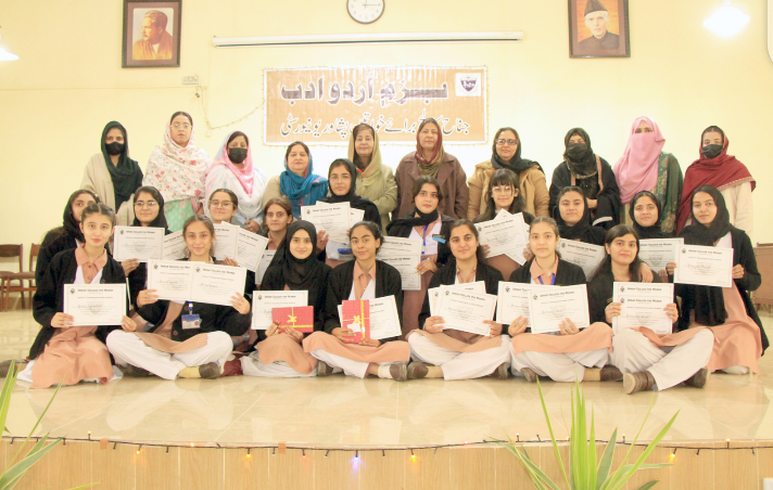 Under the esteemed leadership of Dr. Sadia Khalil, the event showcased outstanding student participation through eloquent speeches, reverent recitations of Allama Iqbal’s poetry, and a captivating preview of the Urdu drama _Anarkali_. The ceremony was honored by the gracious presence of Ms. Bushra Farrukh- renowned poet, scholar, and champion of Urdu literature who served as the Chief Guest. The program was conducted under the guidance of Principal Prof. Dr. Gulnaz Bano.