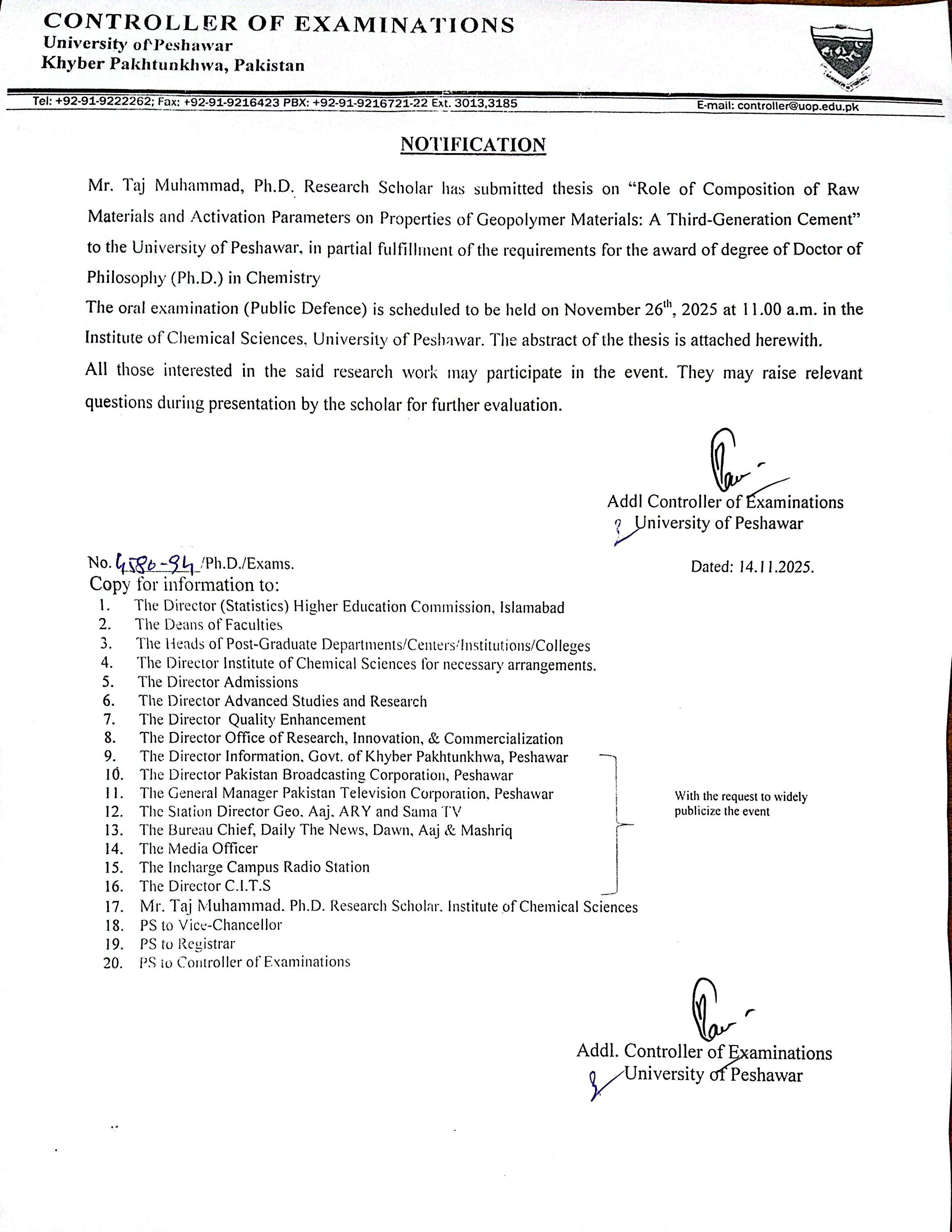 Ph.D Defence of Taj Muhammad, Institute of Chemical Sciences 26 Nov, 2025 - 26 Nov, 2025 11.00 a.m. Video Conference Hall, Centre for IT Services, University of Peshawar at 11:00 For abastract, clcik here