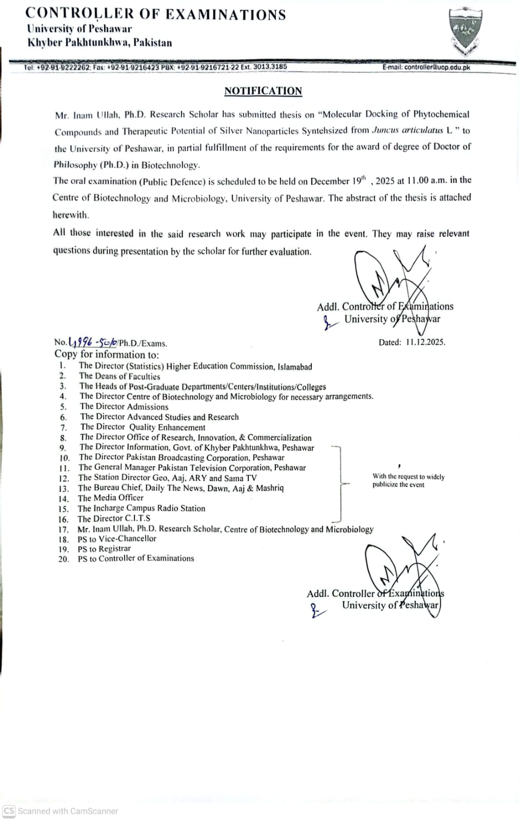 PhD Defence of Inam Ullah 19 Dec, 2025 - 19 Dec, 2025 10:00 a.m. Centre for Biotechnology and Microbiology at 11:00 a.m.