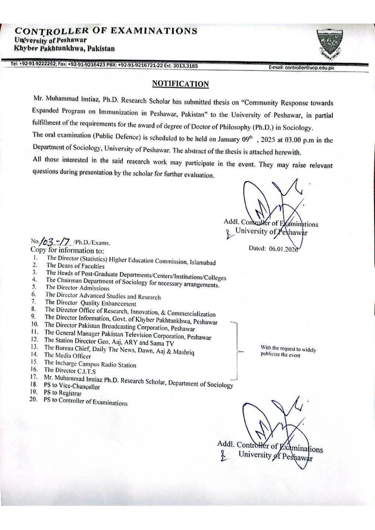 PhD Defence of Muhammad Imtiaz 09 Jan, 2026 - 09 Jan, 2026 03:00 p.m. Department of Sociology at 03:00