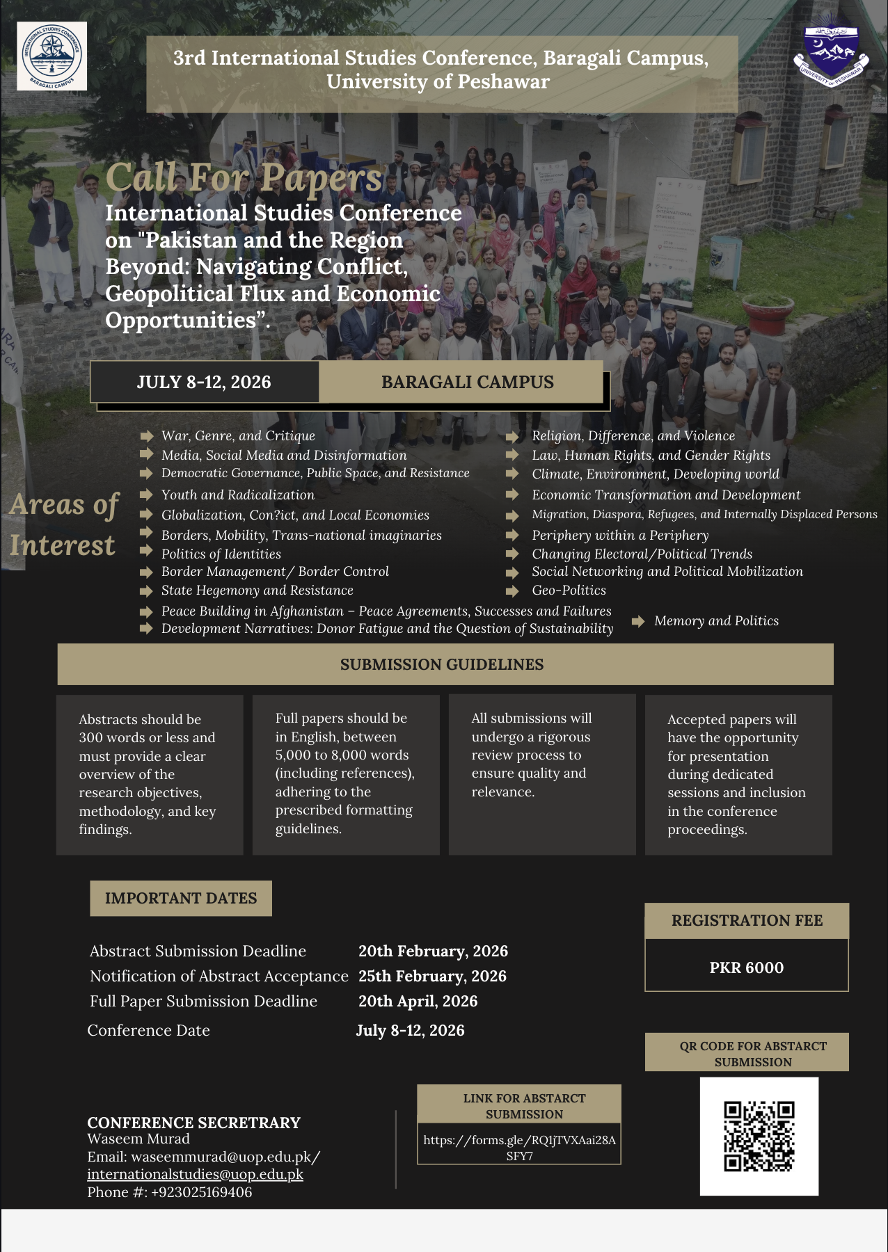 - We request abstracts of 200 words or less. The submission of abstracts is open, and review will start on February 20, 2026. Please submit abstracts through link https://forms.gle/RQ1jTVXAai28ASFY7, for further information contact the conference secretrary through email address internationalstudies@uop.edu.pk or waseemmurad@uop.edu.pk The abstracts will be double-blind peer-reviewed. Rest assured, the committee will announce its decision on February 26, 2026. Detailed papers must be turned in to the coordinator (or to panel chairs) at least a week before the conference starts.