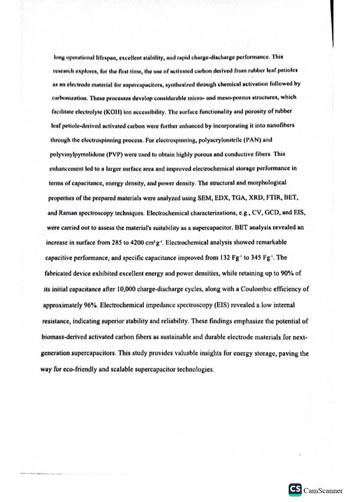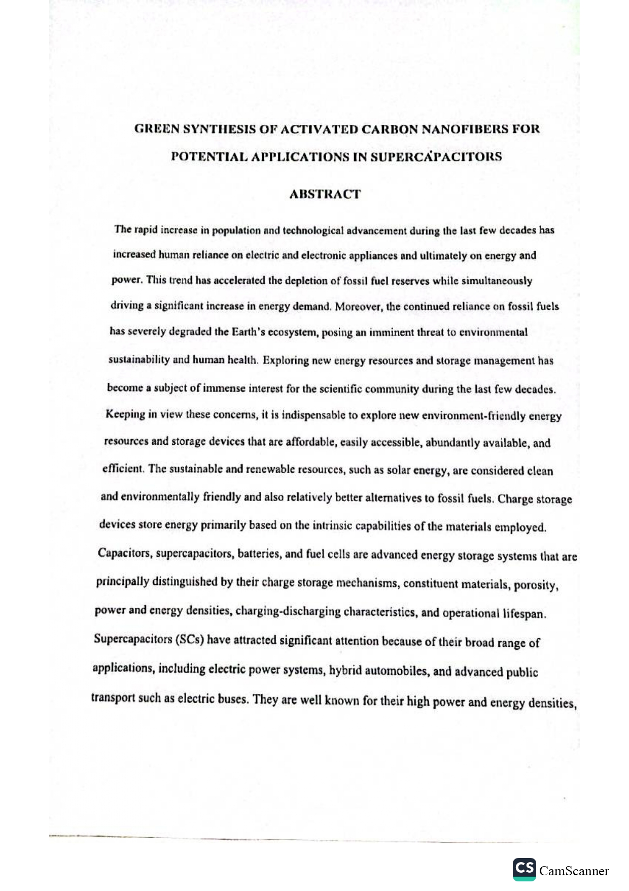 Mr. Falak Niaz, Ph.D. Research Scholar has submitted thesis on "Green Synthesis of Activated Carbon Nanofibers for Potential Applications in Supercapacitors" to the University of Peshawar, in partial fulfillment of the requirements for the award of degree of Doctor of Philosophy (Ph.D.) in Physics.