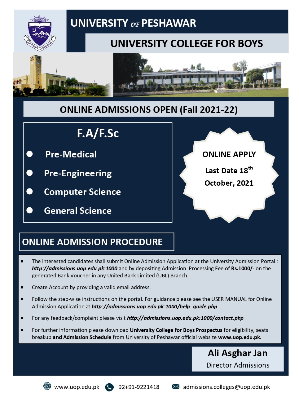 Revised Admission Notice: F.A/ F.Sc Program (Session 2021) at University College for Boys 11, October, 2021 [Click here to Apply Online] [Click here to View Prospectus] [Click here to View Brochure]