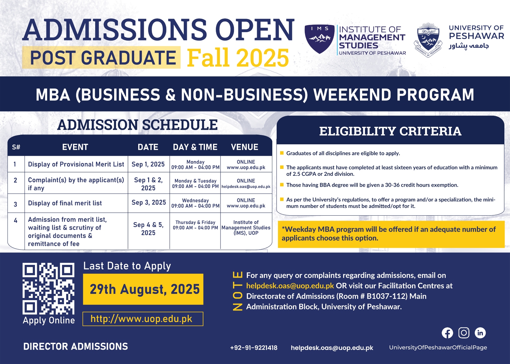 - For any query or complaints regarding admissions, email on helpdesk.oas@uop.edu.pk OR visit our Facilitation Centres at Directorate of Admissions (Room # B1037-112) Main Administration Block, University of Peshawar or dial 091-5611043.