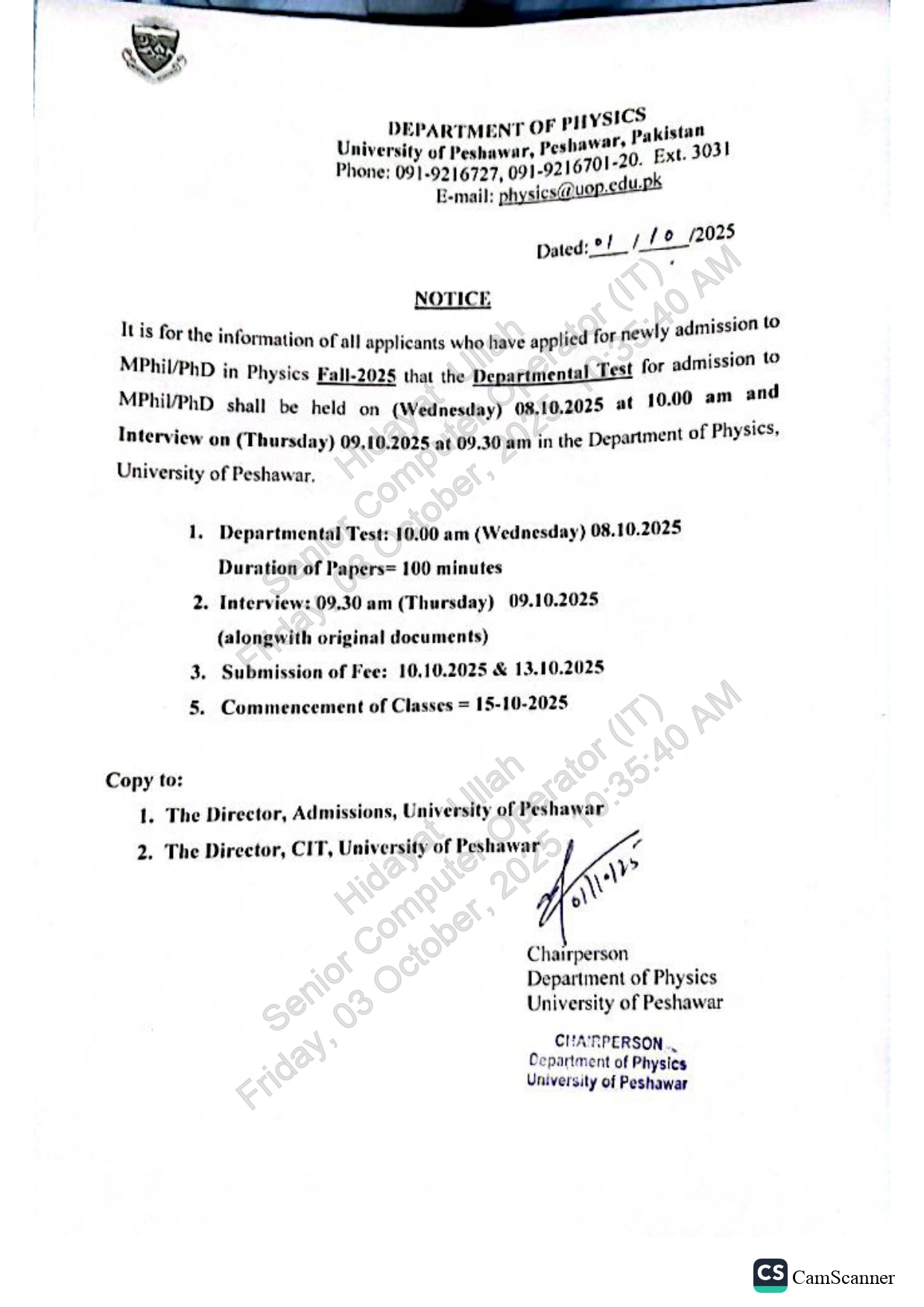 Department of Physics, M.Phil/PhD Test on 8-10-2025, Interview on 09-10-2025