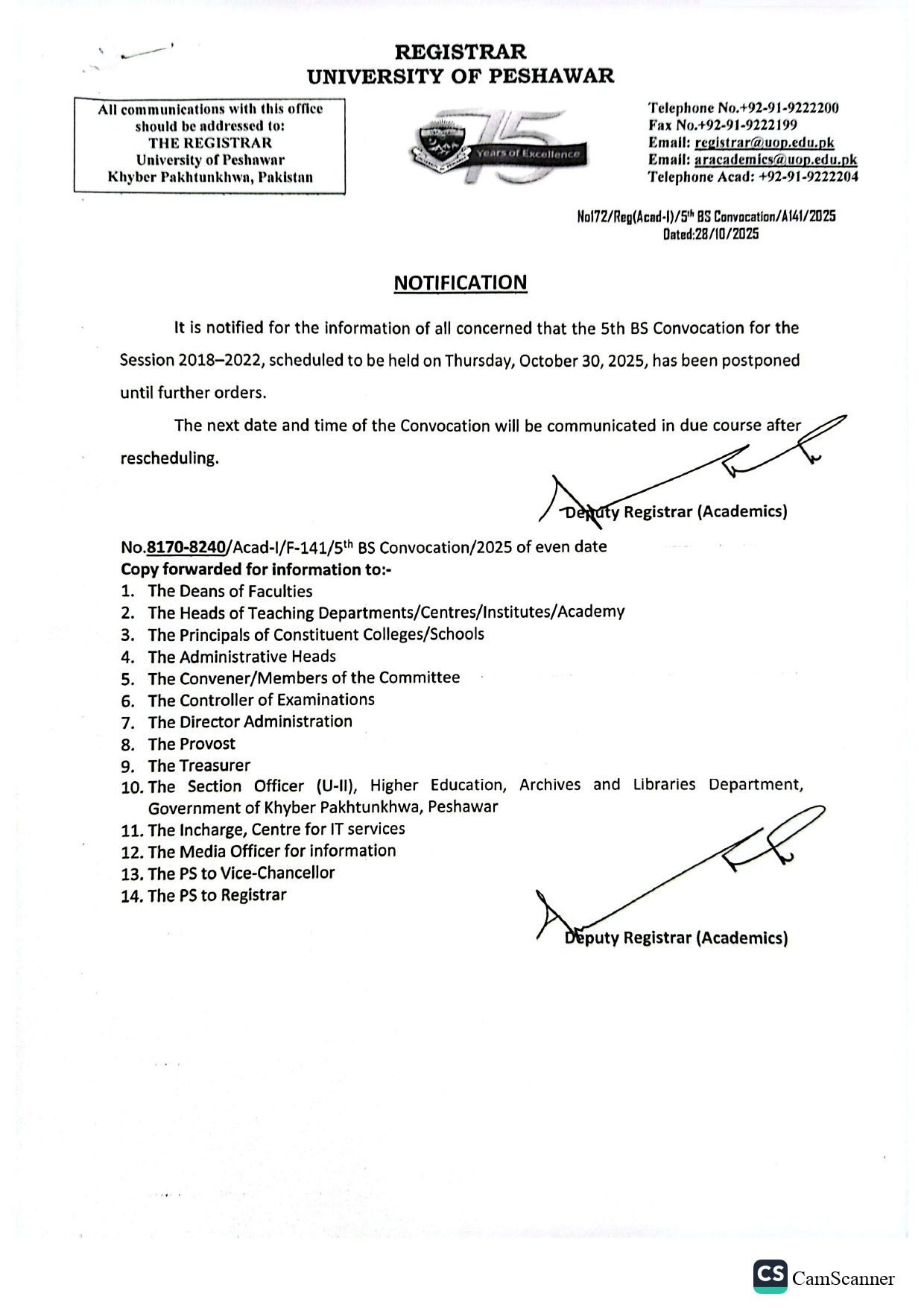 University of Peshawar Convocation scheduled for 30-10-2025 is postponed until further orders. 28, October, 2025