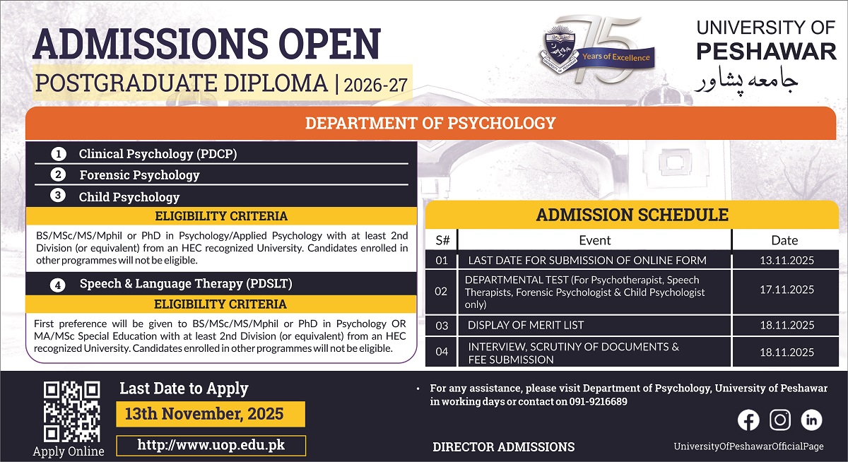 Admissions are Open: One Year Postgraduate Diploma for the Session Fall-2025 31, October, 2025 [Click here to Apply Online] [Click here to View Admission Tutorial]
