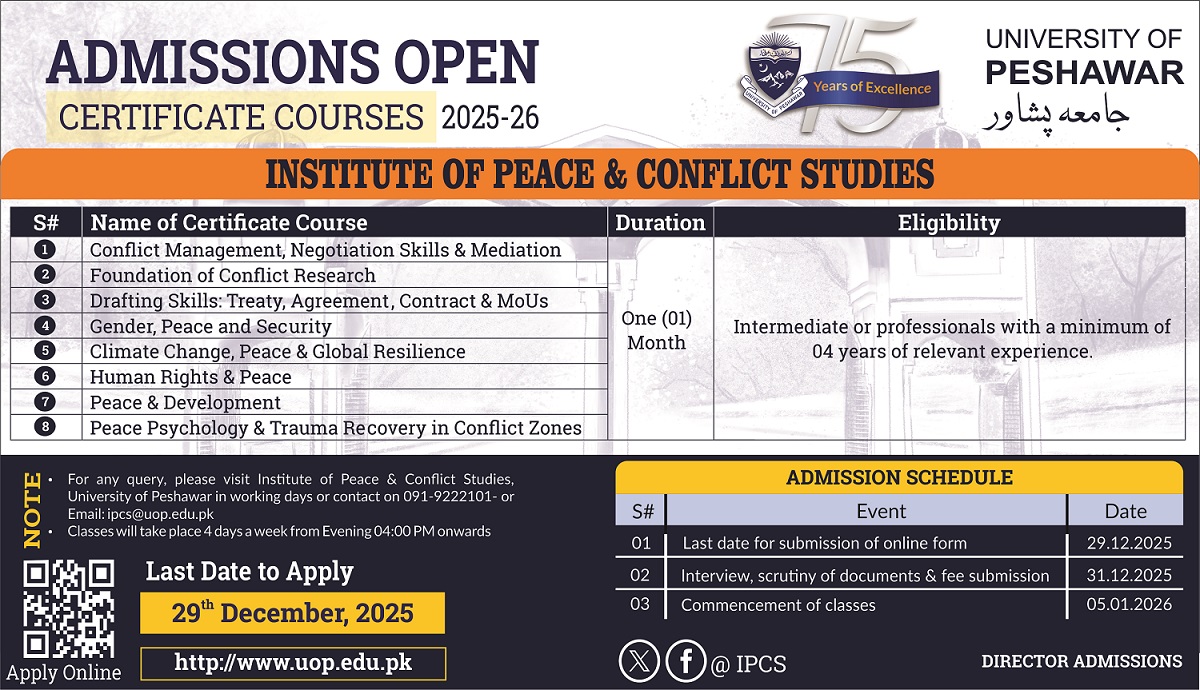Admissions are Open: Certificate Courses in Peace & Conflict Studies 04, December, 2025 [Click here to Apply Online] [Click here to View Admission Tutorial]