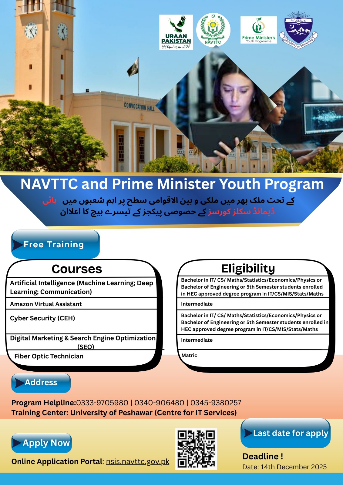 Prime Minister Youth Program: NAVTTC Admissions 2025: Free Training Program: Artificial Intelligence, Fiber Optic Technician, Cyber Security, Digital Marketing, Amazon: Last date extended: Closing Date: 14-12-2025