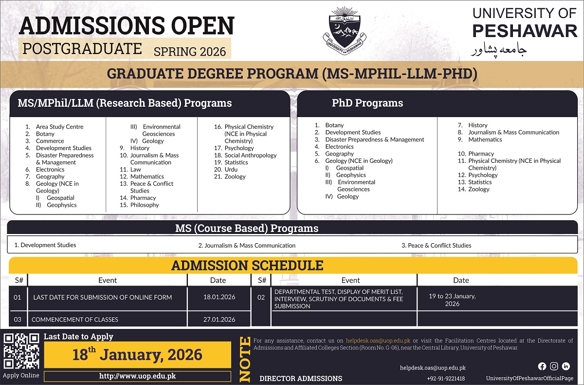 Admissions are Open: Graduate Degree Program (Spring-2026) 06, January, 2026 [Click here to Apply Online] [Click here to View Admission Tutorial] [Click here to View Brochure]