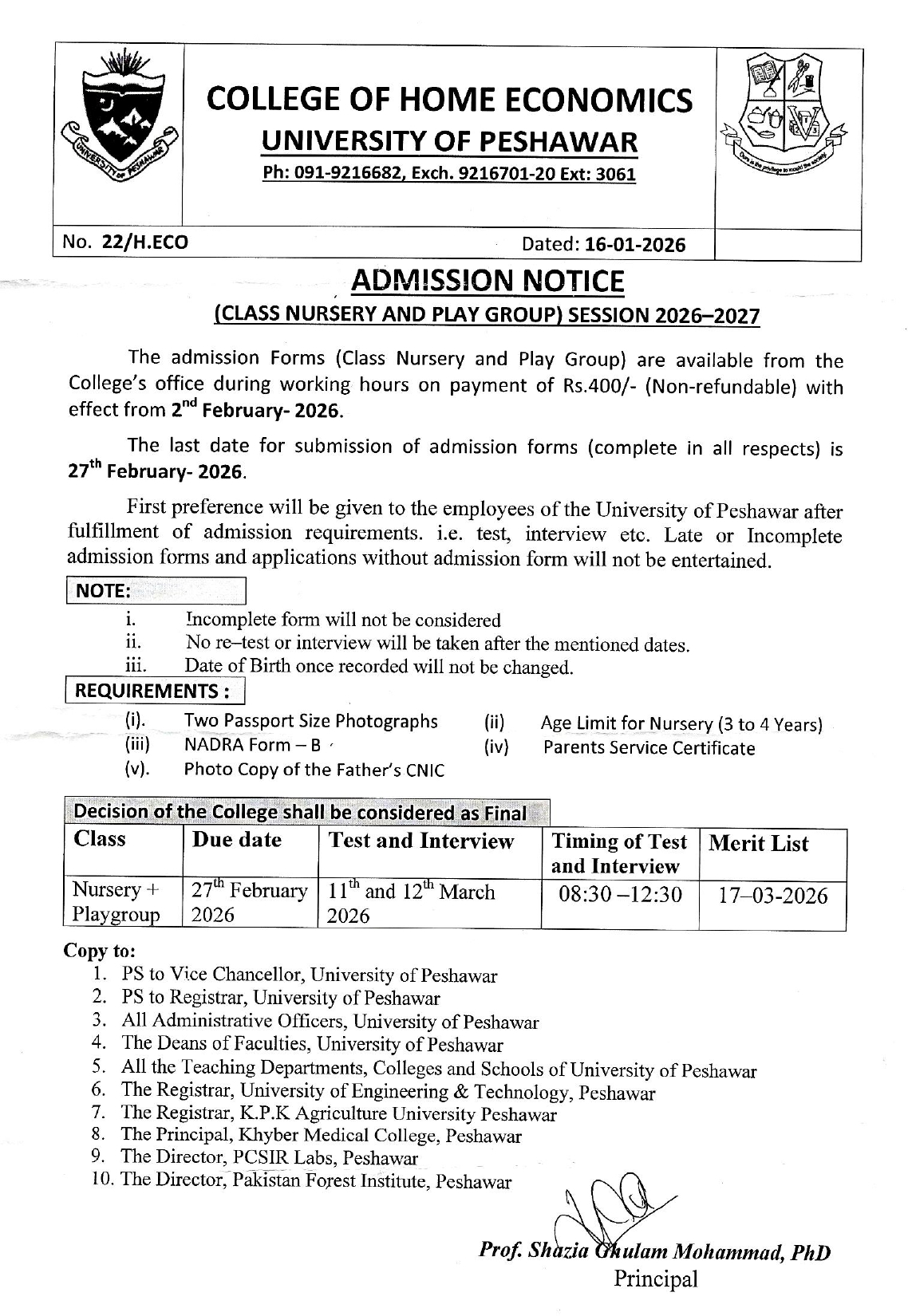 Admission in Nursery and Play Group at College of Home Economics